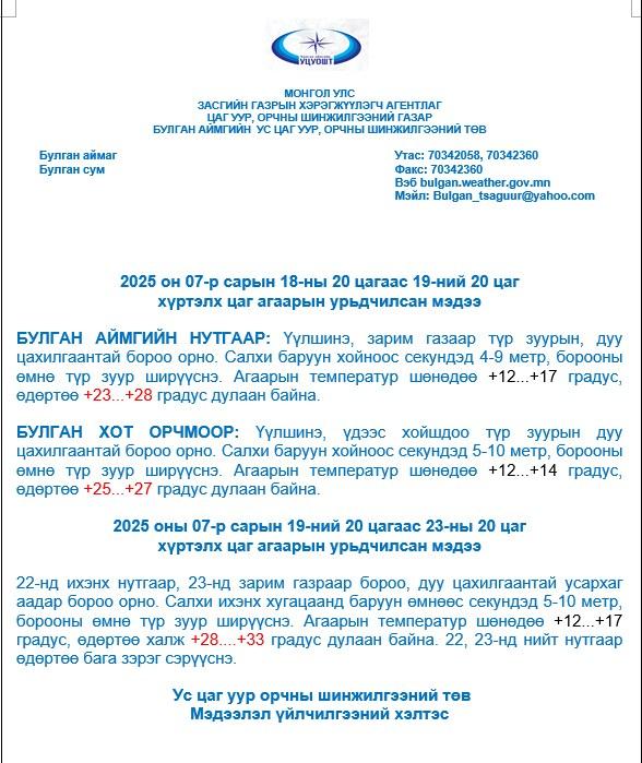 ЦАГ АГААРЫН УРЬДЧИЛСАН МЭДЭЭ