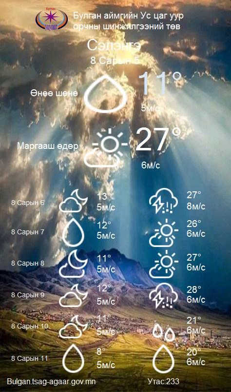 ЦАГ АГААРЫН МЭДЭЭ (2025 оны 08-р сарын 04-нөөс 13-ныг хүртэл¬х) Тунадас: 04, 06-наас 07-нд шилжих шөнө, 10, 11-нд ихэнх нутгаар, 06-нд баруун хэсгээр, 09-нд зарим газраар, 12-нд нутгийн зүүн хойд хэсгээр бороо, дуу цахилгаантай аадар бороо орно. Бусад хугацаанд солигдмол үүлтэй, бороо орохгүй. Салхи: 06-нд зүүнээс секундэд 7-12 метр, зарим газраар түр зуур секундэд 14-16 метр хүрч ширүүснэ. Бусад хугацаанд секундэд 5-10 метр, борооны өмнө түр зуур ширүүснэ. Агаарын температур: 04, 10, 11-нд сэрүүсч шөнөдөө +6...+11 градус, өдөртөө +17...+22 градус, бусад хугацаанд шөнөдөө +10...+15 градус, өдөртөө +23...+28 градус дулаан байна.