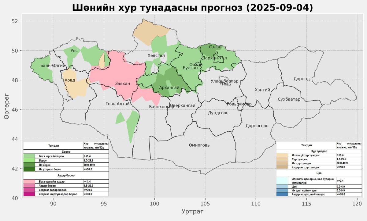 Малчид, иргэд, тариаланчид, хадланчдын анхааралд: 09-р сарын 04-ний өдөр баруун аймгуудын нутгийн зарим газар, төвийн аймгуудын нутгийн баруун болон хойд хэсгээр бороо, дуу цахилгаантай аадар бороо орж, нутгийн баруун хагаст сэрүүсэх тул болзошгүй мөндөр, нөөлөг салхи, аянга цахилгаан, үерийн аюулаас сэрэмжтэй байхыг анхааруулж байна.