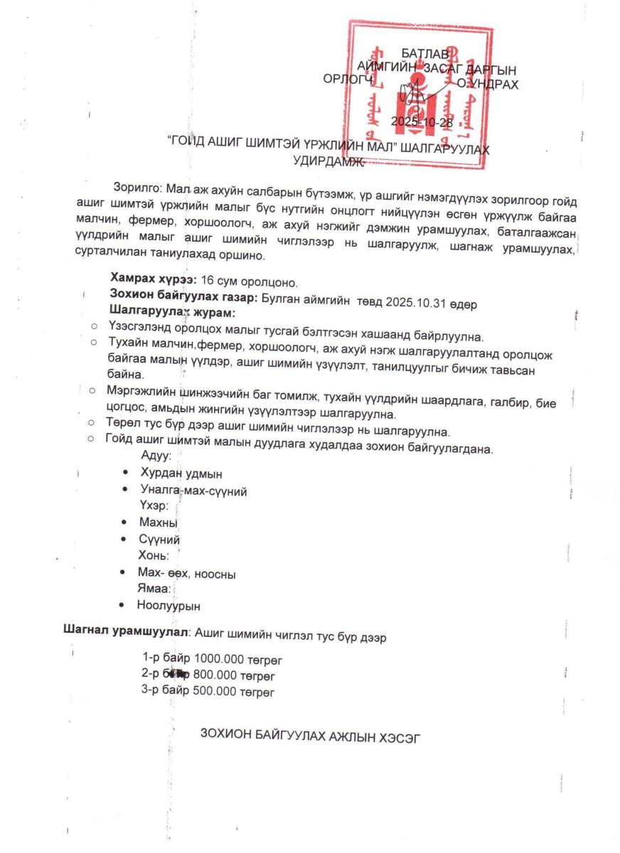 Булган аймгийн төвд "Гойд ашиг шимт" мал шалгаруулах дуудлага худалдаа зохион байгуулагдах гэж байна. Иймд малчид та бүхнийг Өндөр ашиг шимт мал сүрэгтэйгээ очиж оролцохыг урьж байна. ✅ХӨДӨӨ АЖ АХУЙН ТАСАГ лавлах утас 99840941 Жич : Оролцох малын төрлийг удирдамж заасан байна. Хугацаа : 2025 оны 10 сарын 31 нээс 2025 оны 11 дүгээр сарын 01 ны өдрүүдэд зохион байгуулагдана