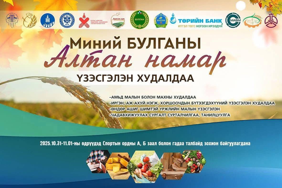“МИНИЙ БУЛГАНЫ АЛТАН НАМАР-2025” үзэсгэлэн худалдаа зохион байгуулагдана Үзэсгэлэн худалдаа 2025 оны 10 дугаар сарын 31-ээс 11 дүгээр сарын 01-ны өдрүүдэд Спортын ордны “А”, “Б” зал, гадаа талбайн асарт зохион байгуулагдана. Аймгийн засаг даргын үйл ажиллагааны "БУЛГАНЫ СЭРГЭЛТ" хөтөлбөрийн “Шинэ хөдөө-сэргэлт”, ”Үйлдвэрлэлийн сэргэлт” хөтөлбөрүүдийн хүрээнд, орон нутгийн өрхийн болон жижиг, дунд үйлдвэрлэл үйлчилгээ эрхлэгчид болон “Шинэ хоршоо-чинээлэг малчин” хөдөлгөөний хүрээнд байгуулагдсан хоршоодын мах, сүү цагаан идээ, төмс хүнсний ногоо, жимс жимсгэнийн борлуулалтыг дэмжиж, сумдын шинээр брэнд болох боломжтой бүтээгдэхүүнийг танилцуулж, хүн амыг хямд үнэ бүхий эрүүл аюулгүй, бүтээгдэхүүнээр хангах зорилгоор “МИНИЙ БУЛГАНЫ АЛТАН НАМАР-2025” үзэсгэлэн худалдаа зохион байгуулагдах гэж байна. Ерөнхий зохион байгуулагч: Булган аймгийн Засаг даргын Тамгын газар Хамтран зохион байгуулагч: Хүнс, хөдөө аж ахуйн газар, Төрийн банк, Хөдөлмөр, халамжийн үйлчилгээний газар, Стандарт, хэмжилзүйн хэлтэс, Статистикийн хэлтэс, Булган сумын ЗДТГ, Булган аймаг дахь Политехникийн коллеж, Ажил олгогч эздийн холбоо, Худалдаа аж үйлдвэрийн танхим, Тариаланчдын холбоо, Хөдөө аж ахуйн хоршоологчдын холбоо