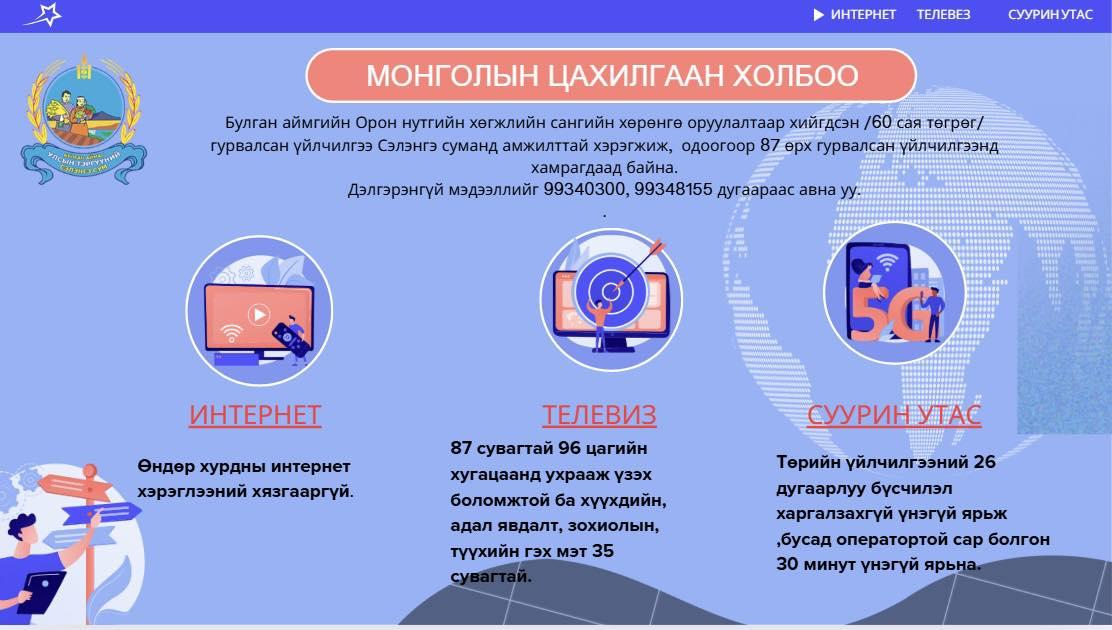 улган аймгийн Орон нутгийн хөгжлийн сангийн хөрөнгө оруулалтаар хийгдсэн /60 сая төгрөг/ гурвалсан үйлчилгээ Сэлэнгэ суманд амжилттай хэрэгжиж одоогоор 87 өрх гурвалсан үйлчилгээнд хамрагдаад байна. Дэлгэрэнгүй мэдээллийг 99340300 99348155 дугаараас авна уу.