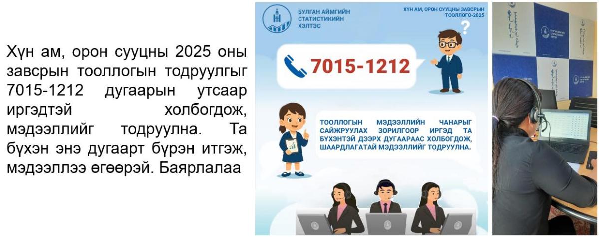 Булган аймгийн статистикийн хэлтэс •Хүн ам,орон сууцны завсрын тооллогын мэдээллийн чанарыг сайжруулах зорилгоор иргэд та бүхэнтэй доорх дугаараас холбогдож шаардлагатай мэдээллийг тодруулна
