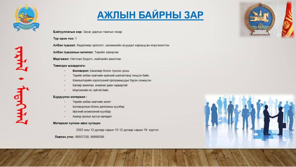 АЖЛЫН БАЙРНЫ ЗАР: Түр орон тоо 1- Хөдөлмөр эрхлэлт, халамжийн асуудал хариуцсан мэргэжилтэн Лавлах утас: 99507338, 99998399