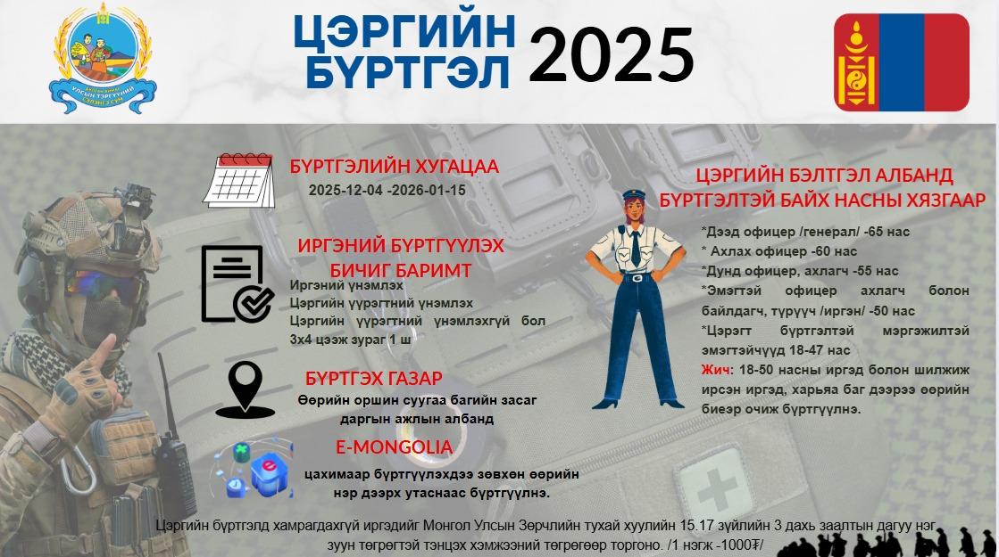 ЦЭРГИЙН ШИНЭЧИЛСЭН БҮРТГЭЛ 2025.12.07-с 2026.01.15 ХООРОД ЯВАГДАНА