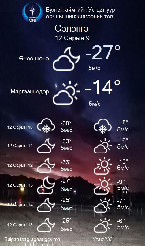 10 хоногийн цаг агаарын урьдчилсан төлөв (2025 оны 12-р сарын 08-наас 17-ныг хүртэлх) Тунадас: 09, 10-нд зарим газраар бага зэргийн цас, 11-нд нутгийн өмнөд хэсгээр, 16-нд ихэнх нутгаар цас орж, цасан болон явган цасан шуурга шуурна. Бусад хугацаанд багавтар үүлтэй, цас орохгүй. Салхи: Ихэнх хугацаанд баруун хойноос секундэд 5-10 метр. Агаарын температур: Эг, Орхон, Сэлэнгэ, Туул голын хөндийгөөр шөнөдөө -24...-29 градус, өдөртөө -12...-17 градус, бусад нутгаар шөнөдөө -17...-22 градус, өдөртөө -7...-12 градус хүйтэн байна. 09-нөөс 12-нд хүйтний эрч бага зэрэг чангарч Эг, Орхон, Сэлэнгэ, Туул голын хөндийгөөр шөнөдөө -28...-33 градус, өдөртөө -17...-22 градус, бусад нутгаар шөнөдөө -23...-28 градус, өдөртөө -13...-18 градус хүйтэн байна