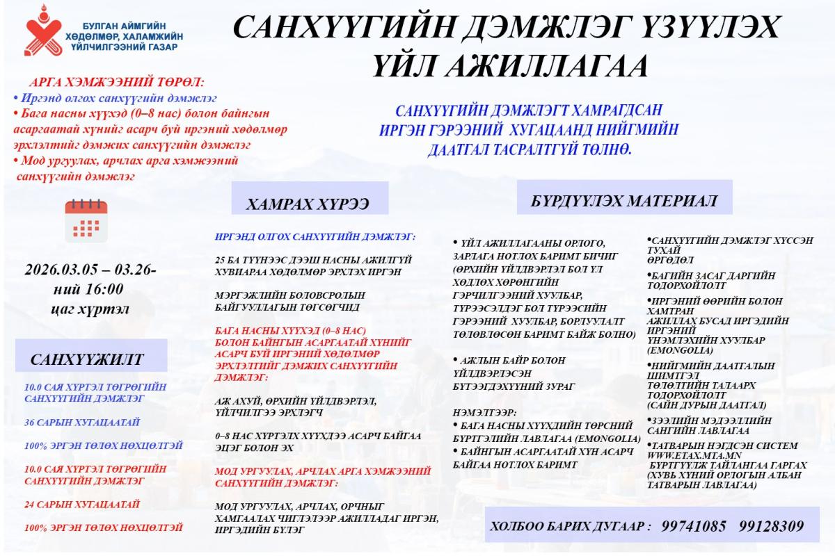2026 оны Хөдөлмөр эрхлэлтийг дэмжих үйл ажиллагааны санхүүгийн дэмжлэгийн материалыг 3-р сарын 25 ны өдөр хүртэл хүлээн авч байна. Дэлгэрэнгүй мэдээллийг харьяа сумын Хөдөлмөр эрхлэлт, халамжийн асуудал хариуцсан сумын мэргэжилтнээс тодруулна уу. Бүрдүүлэх материал: Санхүүгийн дэмжлэг хүссэн өргөдөл Өөрийн болон хамтран ажиллах иргэдийн иргэний үнэмлэхийн хуулбар, Оршин суугаа хаягийн тодорхойлолт Төсөл, эргэн төлөх хуваарийг төлөвлөсөн байх Нийгмийн даатгалын шимтгэл төлөлтийн талаарх тодорхойлолт /Сайн дурын даатгал/ Татварын нэгдсэн систем www.etax.mta.mn бүртгүүлж тайлганах (Хувь хүний албан татварын лавлагаа) Зээлийн мэдээллийн сангийн лавлагаа Үйл ажиллагаа, орлого зарлага нотолсон баримт бичиг (ажлын байр, үйлдвэрлэдэг бүтээгдэхүүн үйчлчилгээний зураг, ажлын байр түрээслэдэг бол түрээсийн гэрээний хуулбар) Хөдөлмөрийн чадвар алдсан комиссын шийдвэр /ХБИ-ий санхүүгийн дэмжлэг олгох арга хэмжээнд/ Малын А дансны хуулабар /малжуулах санхүүгийн дэмжлэг олгох арга хэмжээ/ Холбоо барих утас: 99507338