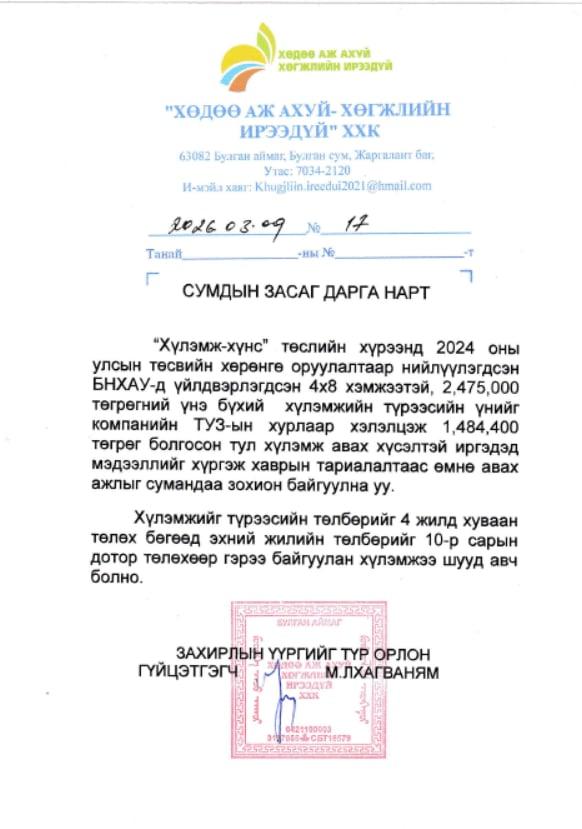Хүлэмж авах хүсэлтэй иргэд ХАА-н тасаг М.Өнөрмаатай холбогдоно уу 99146199