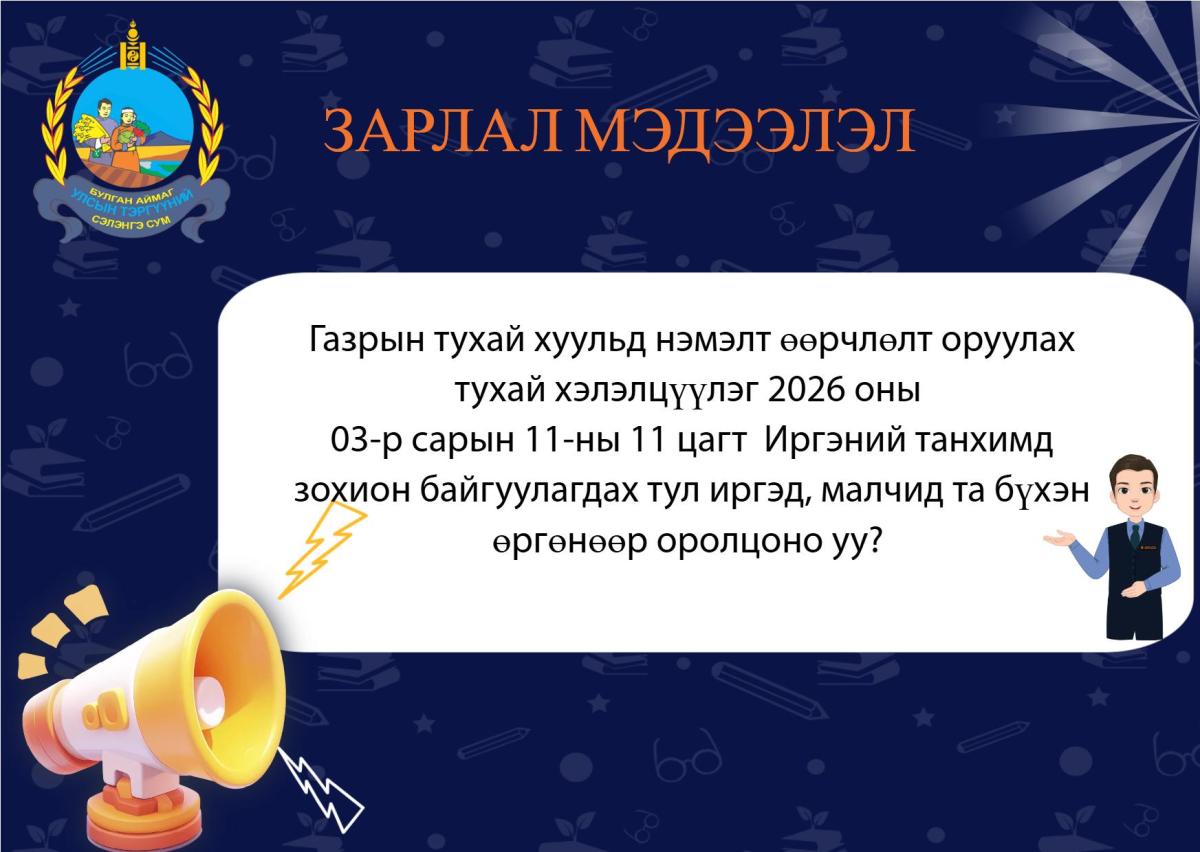 Газрын тухай хуульд нэмэлт өөрчлөлт оруулах тухай хэлэлцүүлэг 2026 оны 03-р сарын 11-ны 11 цагт Иргэний танхимд зохион байгуулагдах тул иргэд, малчид та бүхэн өргөнөөр оролцоно уу? ✅Доорх 5 чиглэлээр санал авна 1.Малчдад өвөлжөө хаваржааны доорх газрыг 1га хүртэлх хэмжээгээр үнэгүй эзэмшүүлэх 2.Орон нутгийн хөгжлийн бодлого, төлөвлөлтийн баримт бичигт тусгагдсан арга хэмжээг төсөл сонгон шалгаруулалтаар олгох 3.Тэжээлийн ургамал тариалах зориулалтаар 5 га хүртэлх газрыг малчин өрхийн хамтын хэрэгцээнд давуу эрхээр эзэмшүүлэх 4.Газар эзэмшүүлэх ашиглуулах асуудлыг орон нутаг шийдвэрлэдэг болох 5.Сумын засаг захиргааны нэгжид харьяалалтай иргэн өөрийн аймаг, сумандаа гэр бүлийн хэрэгцээний зориулалтаар газар эзэмших хүсэлтийг эхэнд эрэмбэлэх
