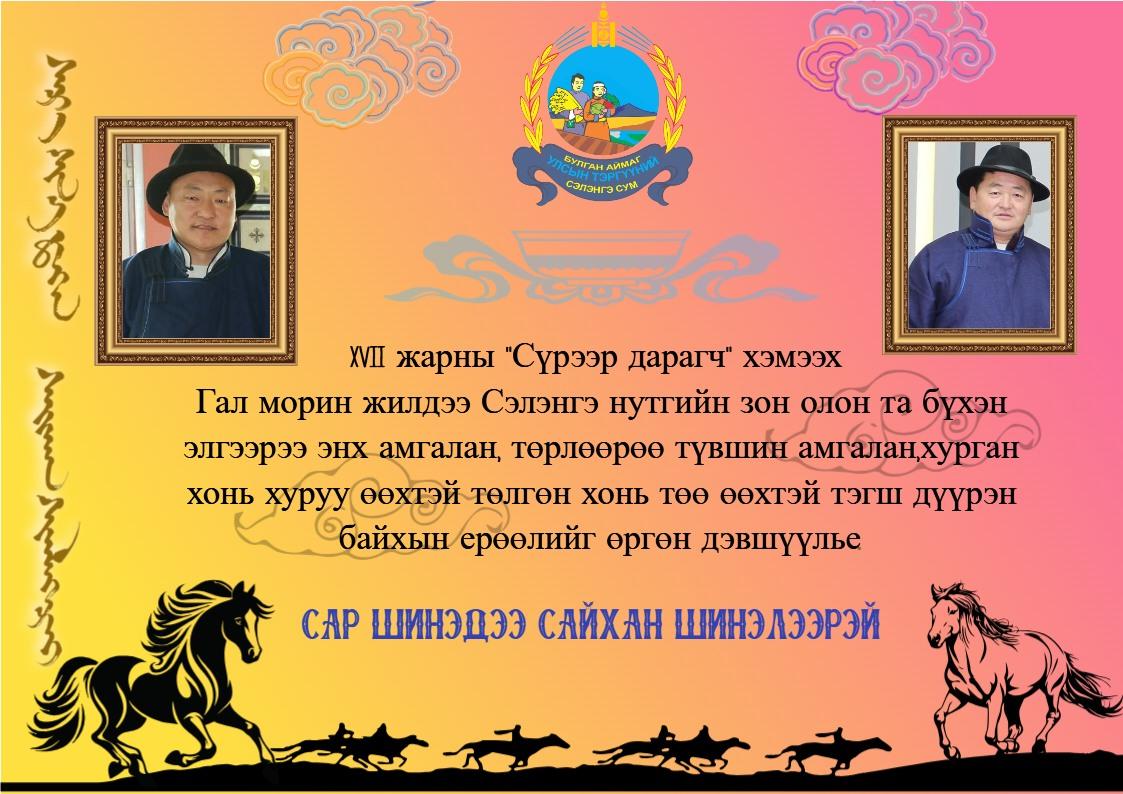 XVII жарны "Сүрээр дарагч" хэмээх Гал морин жилдээ Сэлэнгэ нутгийн зон олон та бүхэн элгээрээ энх амгалан, төрлөөрөө түвшин амгалан, хурган хонь хуруу өөхтэй төлөг хонь төө өөхтэй тэгш дүүрэн байхын ерөөлийг өргөн дэвшүүлье.ТА БҮХЭН МИНЬ САР ШИНЭДЭЭ САЙХАН ШИНЭЛЭЭРЭЙ