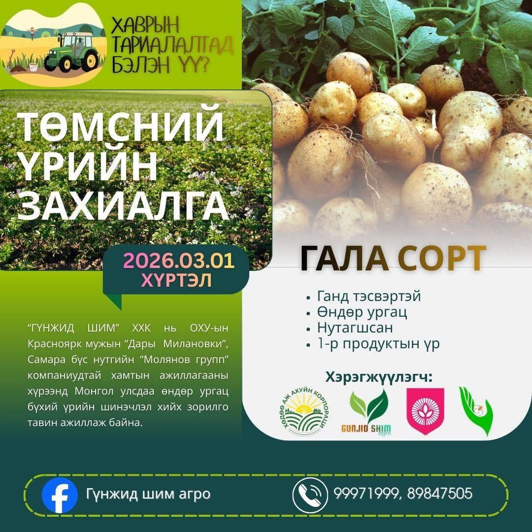 ХАМТРАН АЖИЛЛАЖ БАЙНА Хөдөө аж ахуйн корпораци ТӨХХК нь “ГҮНЖИД ШИМ ” ХХК-тай хамтран ажиллах гэрээ байгуулан ажиллаж байна. Энэхүү хамтын ажиллагааны хүрээнд тариаланч та бүхэнд нутагшсан “ГАЛА” сортын I-р продукцийн үр-ийг төлбөрийн таатай нөхцөлтэйгээр борлуулах боломж нээгдлээ. 2026 оны 03 дугаар сарын 01-ний дотор 50% урьдчилгаа төлбөр авч захиалга хүлээн авна. Холбоо барих: 9997 1999 8984 7505