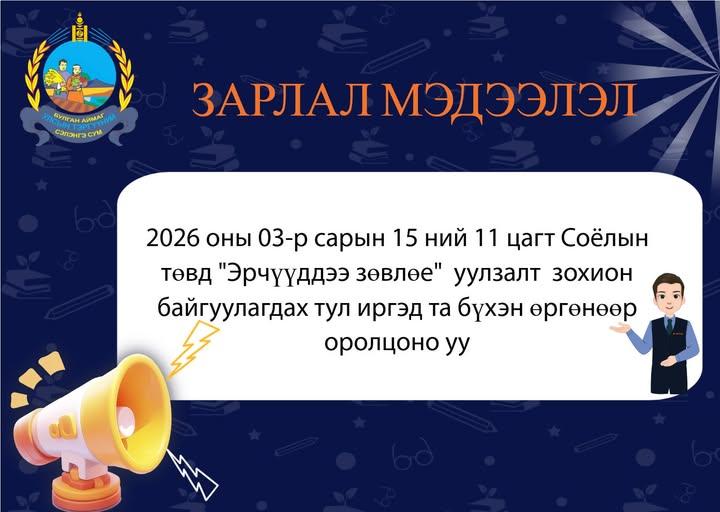 "Эрчүүддээ зөвлөе" уулзалт 2026 оны 03-р сарын 15 ний өдөр зохион байгуулагдах тул иргэд та бүхэн өргөнөөр оролцоно уу