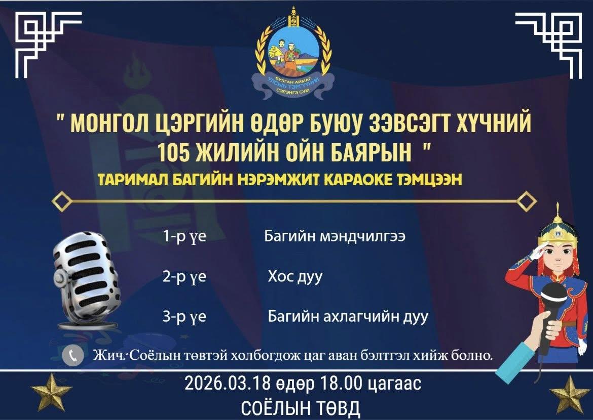 Монгол цэргийн баярыг тохиолдуулан Таримал багийн нэрэмжит караоке дууны тэмцээн зохион байгуулагдах гэж байна. Иймд сумын байгууллага, аж ахуйн нэгжүүд, иргэд, малчид та бүхнийг идэвхтэй оролцож, авьяас билгээ сорин, нэгэн үдшийг хөгжилтэй, дурсамжтай өнгөрүүлэхийг урьж байна
