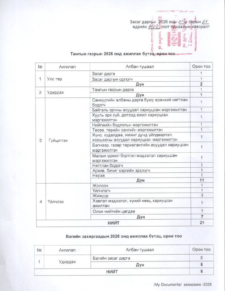 Сэлэнгэ сумын ЗДТГ-ын бүтэц, орон тоо